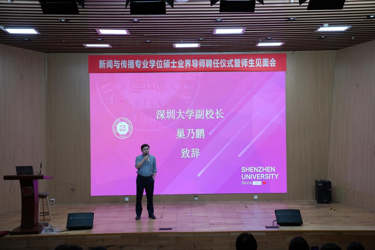 首先,深圳大学副校长巢乃鹏教授致辞。他充分肯定了传播学院在专业学位硕士培养中的创新探索,并强调业界导师制度对构建“产学研用”一体化人才培养体系的重要意义。他表示,业界导师的加入将为学生提供实践智慧与行业洞察,助力深大培养兼具学术底蕴与实践能力的复合型传媒人才。