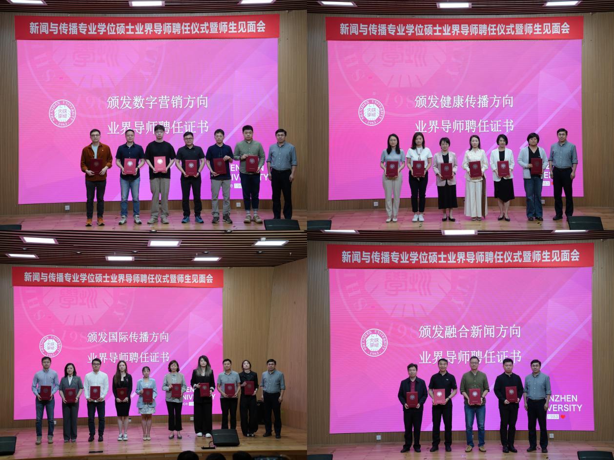 为深化产教融合,进一步提升专业学位硕士人才培养质量,传播学院于4月26日上午9点在粤海校区南校区艺术学部一楼报告厅举办“2025年新闻与传播专业学位硕士业界导师聘任仪式暨师生见面会”。受聘的业界导师主要来自全国新闻传播业界具有标杆和代表性的政府机构和企业,包括腾讯、比亚迪、深圳广电集团、华扬联众、深圳慢性病防治中心、深圳市疾病控制中心等50多家机构的负责人和业务骨干共61人。