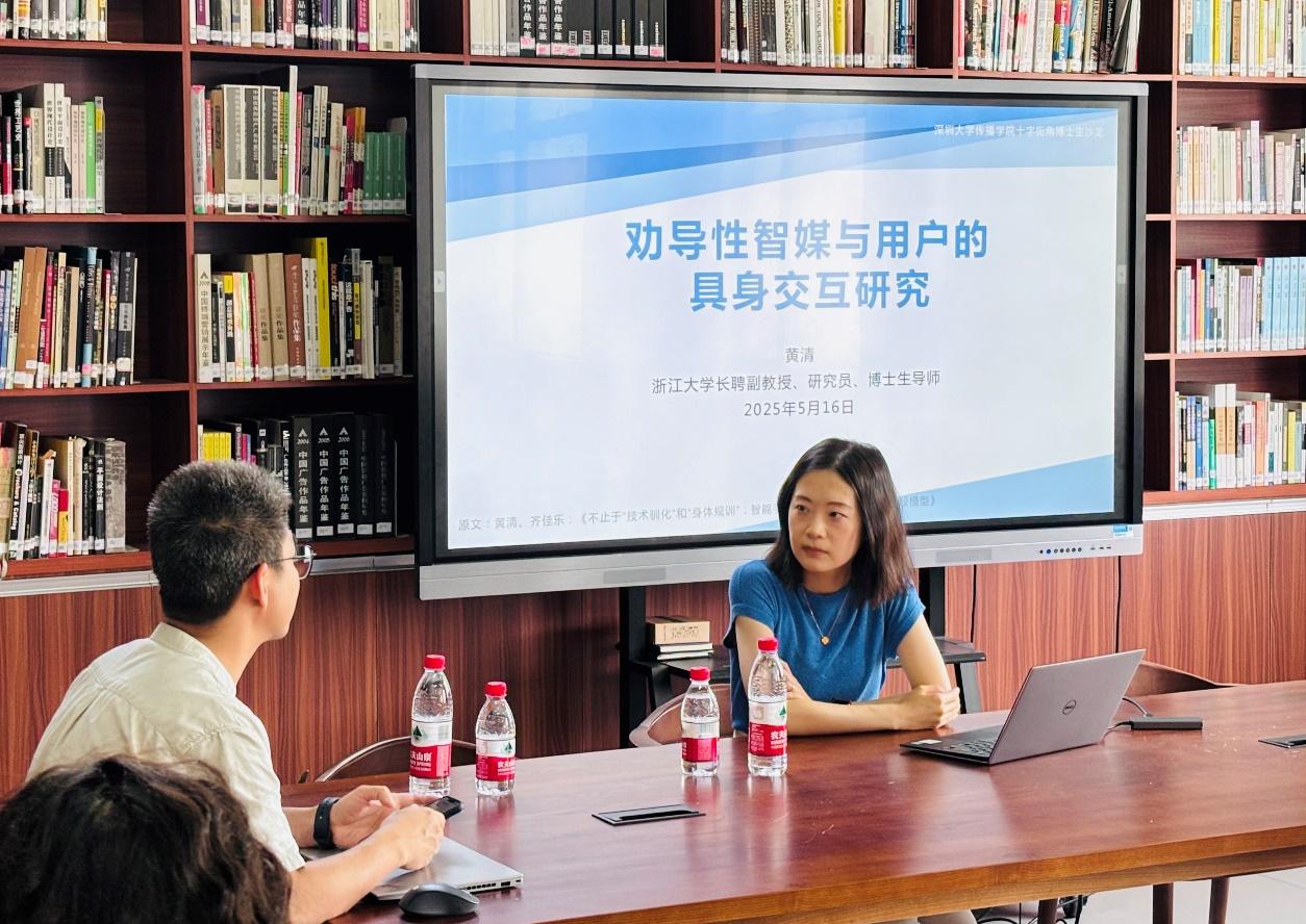2025 年 5 月16日中午,传播学院举办第三期“十字街角”博士生沙龙,本期主题为“劝导性智媒与用户的具身交互研究”,由浙江大学长聘副教授、研究员、博士生导师黄清老师主讲。黄清长期致力于数字智能媒介应用引发的风险隐患及其防范研究,近年来尤为关注生成式人工智能风险与内容安全,学术成果丰硕。讲座由传播学院助理教授黄文森老师主持,在深圳大学粤海校区南区致艺楼L7三楼图书室举行,众多师生积极参与。