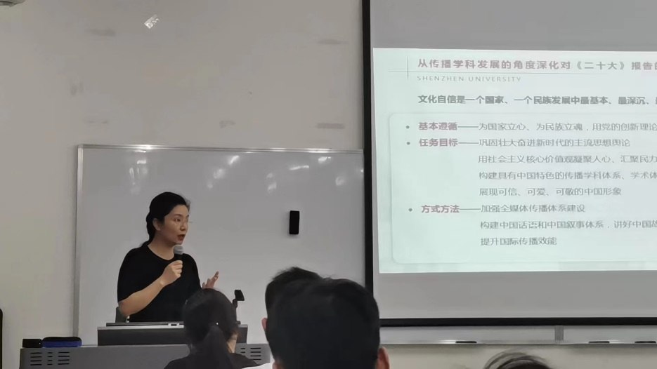 结合学习党的二十大关于推进文化自信自强,铸就社会主义文化新辉煌的论述,周小茜书记结合学院的学科特点,指出传播学院师生要为国家立心、为民族立魂,用党的创新理论指导传播实践。要以加强全媒体传播体系建设,构建中国话语和中国叙事体系,讲好中国故事、传播好中国声音;提升国际传播效能为己任,承担好巩固壮大奋进新时代的主流思想舆论,用社会主义核心价值观凝聚人心、汇聚民力,构建具有中国特色的传播学科体系、学术体系、话语体系,展现可信、可爱、可敬的中国形象的职责。