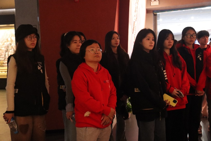 “这个纪念馆就像一部电影,将红军的事迹呈现在我们面前,十分具有感染力。里面的许多雕塑和展品特别精美,我也为此所震撼,心里不自觉地热血沸腾,这对我的表演很有启发意义。”担任红军演员的胡同学感叹道。师生们沿着纪念馆的五大篇章——《红色星火 燎原粤北》、《战略转移 踏上征程》、《攻占城口 突破封锁》、《西进乐昌直取湘南》与《血沃油山 红旗不倒》回溯中央红军1934年10月25日至11月14日长征过境粤北的革命记忆。一段段汗血书就的文字与一件件沾满尘土的红军文物让同学们联想起自己的舞台和故事,红军长征精神与爱国主义热情一时间充满了整个纪念馆。