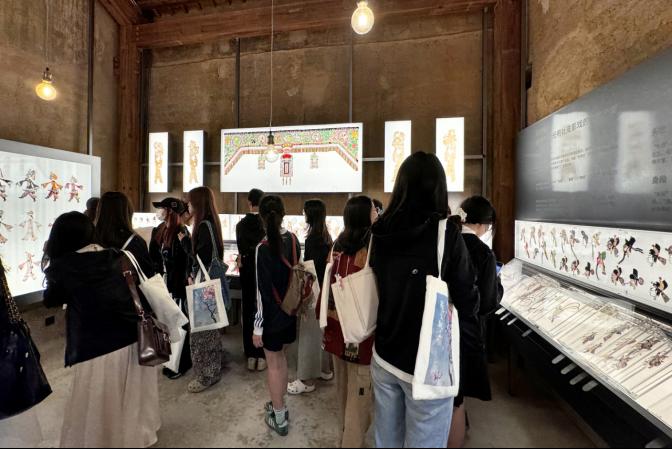 此外,团队还参观了张国立老师收藏皮影艺术展。身处光影与精美的艺术装置间,大家沉浸式地观赏被誉为“中华戏曲之父”和“世界皮影之祖”的华县皮影,欣赏“一口叙还千古事,双手对舞百万兵”的艺术形象。或细腻质朴、或幽默夸张,同学们流连于深藏在非遗技艺深处的民风民俗与历史底蕴,在传统文化的当代演绎中开阔视野、深受启发。