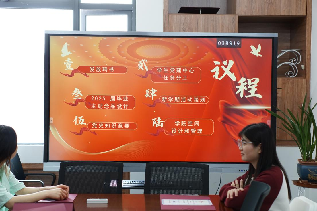 会议伊始,李岸莼、方泽宏老师为党建工作中心新任学生干部及学生干事颁发聘书,勉励全体成员履职尽责,并对新学期学生党建工作中心的工作进行了全面部署和动员。学生党建工作中心作为学院党建工作的重要力量,要充分发挥先锋模范作用,切实做好党员发展、教育管理、组织建设、宣传推广等各项工作,为学院党建工作注入新的活力。