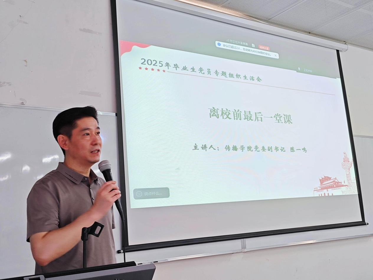 6月21日上午,传播学院在L7-306教室召开2025年毕业生党员专题组织生活会。此次会议主要围绕帮助毕业生党员坚定理想信念、牢记初心使命,以及顺利完成组织关系转出等重要工作开展。由学院党委副书记陈一鸣同志主讲专题党课,组织员李岸莼老师负责组织关系转出相关培训。