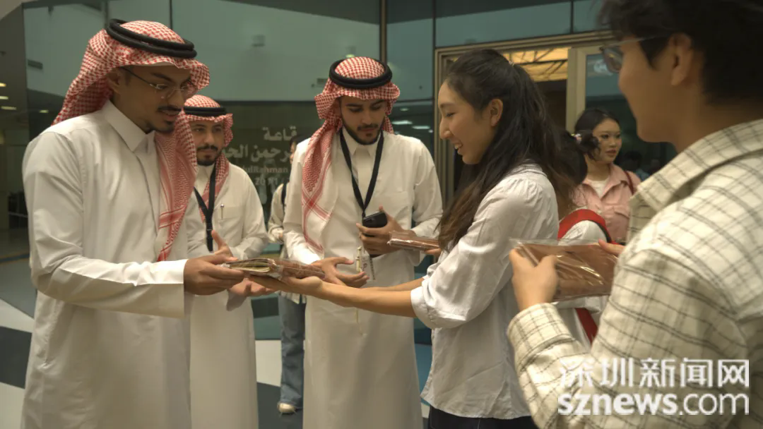 深大学生向沙特学生赠送纪念品。