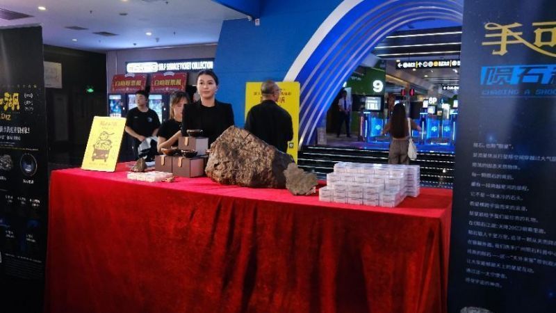 活动现场,电影宣发队的深大学生们制作的五位电影主角的人形立牌、精美海报。广东省行星科学研究有限公司暨广州陨石科普中心为电影《陨石江湖:天降20亿》赞助了888枚陨石切片样品,并在活动现场进行陨石行星科普,公开展映价值上百万的灶神星陨石以及相关的陨石制品。