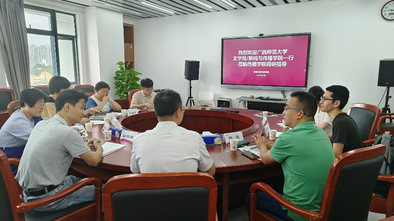 彭华新副院长代表传播学院全体师生向广西师范大学文学院/新闻传播学院一行的到来表示热烈欢迎。座谈会上,彭院长向各位老师介绍了传播学院的基本情况,并着重介绍了我院的办学特色,包括传播学院正在参与组建的全国新闻院系校园媒体联盟。