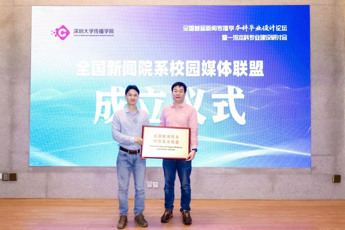 在本次论坛上,为了进一步促进新闻院系与媒体、院系之间的交流与合作,深圳大学传播学院立足于搭建校园媒体与实践教学的桥梁,致力于探索校园媒体融合创新的新模式、新路径,联合复旦大学、深圳大学、南京大学、中山大学、华东师范大学、南京师范大学、湖南师范大学、湖南大学等八所院校的新闻院系、知名媒体机构成立“全国新闻院系校园媒体联盟”,以实现学校与媒体之间的资源互通,校园媒体间的通力合作。联盟的成立不仅是对新闻教育和校园媒体实践的一次大胆创新,更是对新闻传播人才培养模式的一次积极探索,以期通过联盟为培养新时代新闻传播人才,推动媒体融合创新,新闻传播事业繁荣发展贡献深大力量。