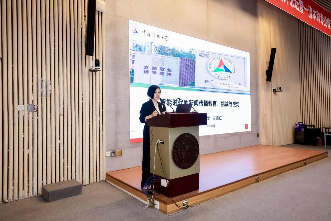中国传媒大学本科生院院长王晓红教授以《人工智能时代的新闻传播教育:挑战与应对》为题进行演讲。她认为,人工智能时代的颠覆性技术正在重构整个教育体系、教育理念和人才培养方式,学界业界更需要构建专业知识图谱,把握媒体人的初心与内核。她指出,新闻传播教育要注重学业与业界对接,在实践中不断更新教学内容和方法,以适应新的传播环境和媒体形态。