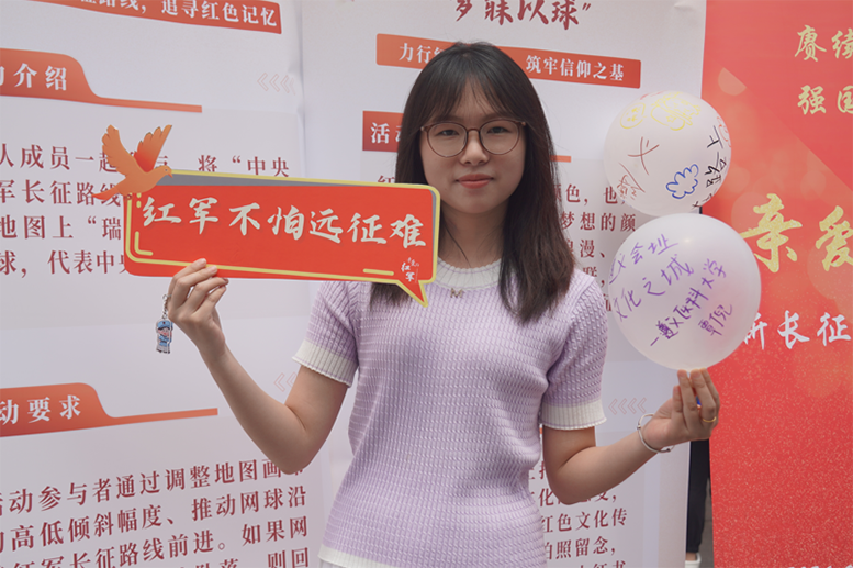 互动环节共分为“重走红军路”、“气球红色寄语”、“红军相框拍照打卡”三个部分,每个部分安排相应的长征知识趣味游戏及《亲爱的红军》文创周边礼品,寓“学”于乐,将长征精神以青春的气息、创意的方式传得更深、更远。