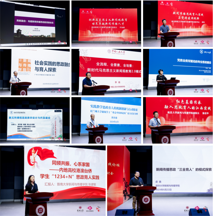 主旨演讲环节,各高校代表精彩分享思政育人特色,共话思政创新路径。南京大学新闻传播学院执行院长张红军、陕西师范大学新闻与传播学院院长许加彪、南京师范大学新闻与传播学院党委书记周伟、广州大学新闻传播学院党委书记邹军、中国人民大学新闻学院副院长李彪、浙江大学传媒与国际文化学院副院长赵瑜、华中科技大学新闻与信息传播学院副院长李华君、兰州大学新闻传播学院党委副书记周兆瑜、南昌大学新闻与传播学院副院长陈世华、暨南大学新闻与传播学院党委副书记张建敏、清华大学新闻与传播学院副教授虞鑫进行主旨发言,深圳大学传播学院副院长、马克思主义新闻观创意传播与实践党支部书记黄玉波教授主持发言。