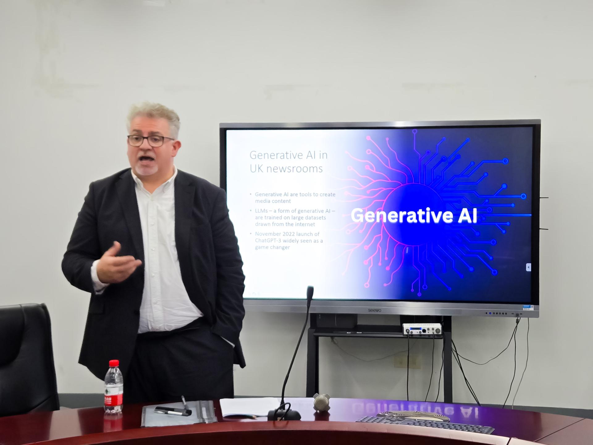 活动伊始,传播学院副院长杨洸作为此次活动主持人,为到场师生详细介绍了卡迪夫大学及其新闻媒体与文化学院的基本情况。该学院是全球十大新闻学院之一,在新闻传播领域享有盛誉。随后,Matt Walsh教授带来了一场题为“生成式人工智能——平衡英国新闻编辑室的道德与颠覆(Generative Artificial Intelligence—Balancing Ethics and Disruption in UK Newsrooms)”的学术讲座。Walsh教授指出,生成式人工智能在新闻生产与编辑中具有诸多优势和潜力,但在实践中也存在一定的风险和伦理问题。如何妥善平衡生成式人工智能在新闻编辑室中的优势与风险,将成为未来构建人机共生关系的关键所在。Walsh 教授还与现场师生围绕“新闻编辑室如何通过训练 AI 减少内容偏见”以及“新闻编辑室中谁该为 AI 错误买单”等问题进行了深入探讨,引发了师生们的热烈反响。