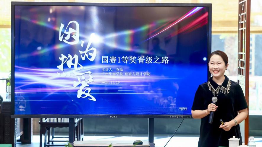 交流会中,优秀指导教师代表孙海婴老师与优秀组织工作者代表乔磊老师,分享了指导学生参赛获奖的经验与教学体会,为参会教师提供了宝贵的借鉴与启示。孙海婴教授作为广东轻工职业技术大学的资深教师,凭借其丰富的教学和指导经验,分享了从2018-2024年间大广赛国奖的获奖历程,详细阐述了参赛前的准备工作、如何把握大广赛的新趋向与教学的相互促进。乔磊博士则结合其在广州华商学院的执教经历,讲述了因热爱而投身教育的心路历程。她分享了如何在命题公布前提前准备UI赛道,以及通过荣誉感与仪式感激发学生群体效应的经验。同时,她还强调了学校对赛事大力支持对于提升学生参赛积极性与获奖成果的重要性。两位老师的精彩分享赢得了现场阵阵掌声,为参会教师提供了宝贵的经验与启示。