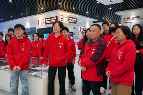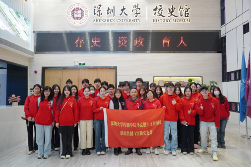 最后,周小茜勉励全体成员紧紧围绕习近平文化思想,讲好中国故事,赓续红色基因,以《亲爱的红军》为起点,在粤港澳大湾区和社会主义先行示范区通过科学实践切实推动“两个结合”,聚力立新、阔步前行,在新时代的长征路上书写属于Z世代的红色传奇。 学史增信促担当 凝心聚力启新程 为构建常态化学习机制,通过强化理论武装夯实思想根基,提升师生队伍的责任担当意识和实践创造能力,2025年2月21日,深圳大学传播学院马克思主义新闻观创意传播与实践党支部与大型原创剧目《亲爱的红军》创作团队走进深圳大学校史馆,以校史研学的特殊形式开启新学年思政教育新征程。在参访深圳大学校史馆过程中,师生重温学校与国家同呼吸、与特区共奋发的历史足迹,感悟深大“自立、自律、自强”的精神内核,并围绕创建“双一流”高校,服务教育强国建设、助力“双区”发展战略的重要使命展开讨论。