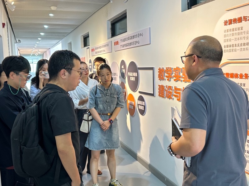 最后,华南师范大学教育信息技术学院一行还参观了深圳大学国家级传媒实验教学示范中心,走访数字影像创作实验室、新媒体创新实验基地等,实验中心副主任严嘉伟向来访老师耐心讲解了实验室平台建设、教学运行系统、管理运作体系和运营管理等方面的情况。