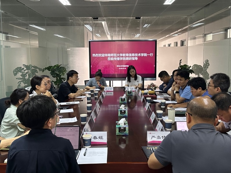 2025年5月15日上午,华南师范大学教育信息技术学院副院长刘兢、新闻传播系主任夏宝君、副主任徐志武、新闻学专业主任彭柳等一行9人到访深圳大学传播学院。双方就新闻传播类专业培养方案、人工智能在新闻传播教学科研中的应用、一流课程建设、教学成果奖的凝练与培育等内容进行交流。深圳大学传播学院副院长彭华新、新闻系系主任陈显玲、网络与新媒体系副系主任王伟、院长助理黄文森、新闻系助理教授李辉、聂鑫,以及实验中心副主任严嘉伟接待本次来访。