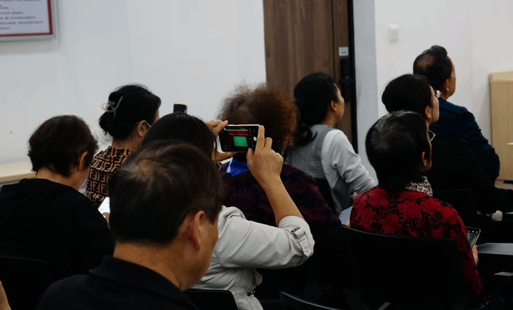 刘国琪在了解社区居民使用人工智能APP的基本情况后,从人工智能的基本概念出发,以通俗的语言讲解生成式模型与推理式模型两大类技术的特点与区别,并借助生活化案例帮助居民们更好地理解AI的不同功能。他结合信息整理、纠纷调解等社区常见场景,演示如何通过AI工具高效处理日常事务,并手把手教学多种通用对话公式,引导居民掌握与AI高效沟通的技巧。现场不少居民举起手机拍下讲解内容进行记录学习,跟随讲解同步操作手机APP,还主动提出要学习使用AI 进行PPT制作,现场学习氛围热烈。