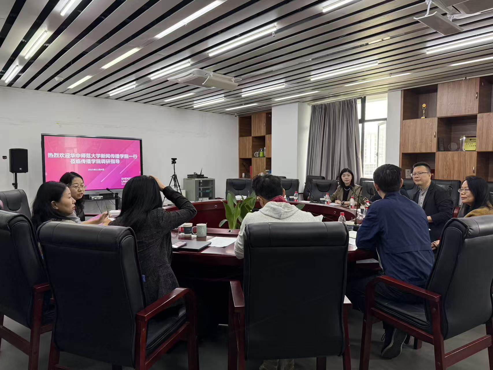 12月4日上午,华中师范大学新闻传播学院党委副书记程秀莉、副院长陈科、副教授张继木和教学秘书吴迪等一行到访深圳大学传播学院,与传播学院党委副书记陈一鸣、副院长彭华新、网络与新媒体系主任曹博林、新闻系副主任吴怿、实验员张一及教学秘书邓慧娟等座谈交流。双方聚焦新时代传媒人才培养,围绕实战化教学、毕业设计、产教融合、思政教育等要点,就新闻传播人才培养新机制展开深度探讨交流。