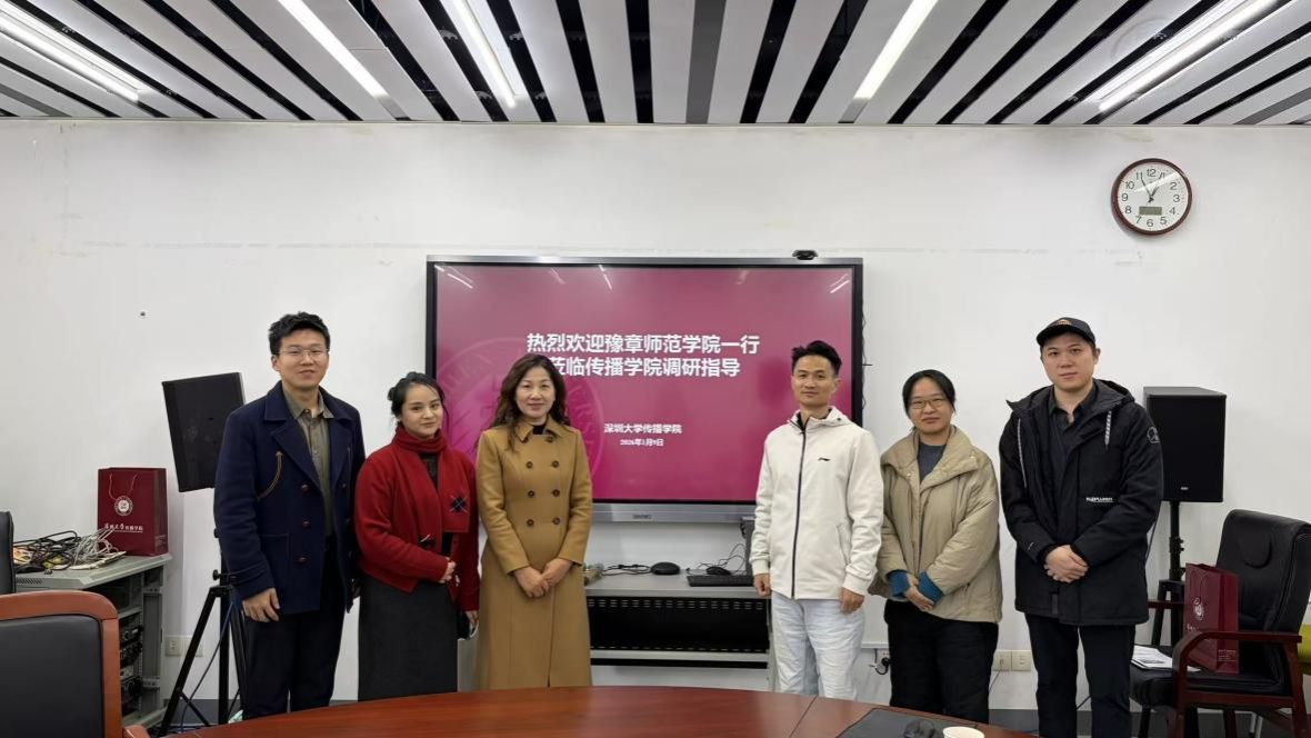 1月9日上午,豫章师范学院数字媒体与创意产业学院负责人封亚玲、教务科长刘红丽、网络与新媒体系教研室主任赵振宇一行到访深圳大学传播学院进行调研交流。深圳大学传播学院副院长彭华新、网络与新媒体系副主任王伟、国家级实验教学示范中心教师付豪接待了来访嘉宾,双方就学科发展、人才培养、产学研融合等议题在致艺楼会议室展开交流。
