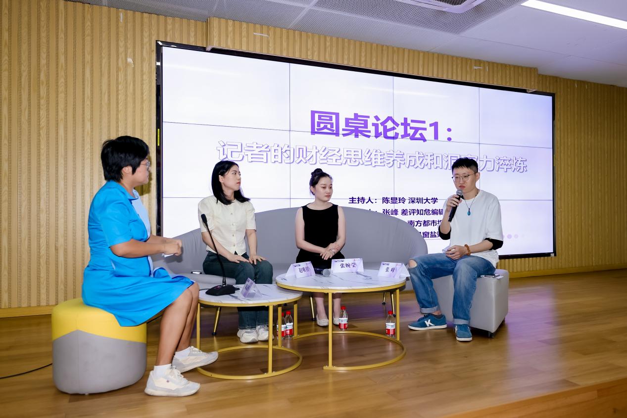 在第一场圆桌论坛环节,传播学院新闻系主任陈显玲对话来自差评知危编辑部张峰、南方都市报赵唯佳和南风窗盐财经张婉莹,共同探讨“记者群体的财经思维养成和洞察力淬炼”。