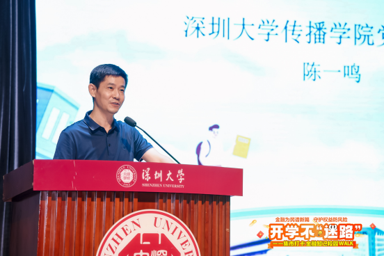 传播学院党委副书记陈一鸣在致辞中表示,防诈反诈宣传教育系列活动的成功举办,近500名新生的积极参与,推动了金融安全知识和防诈反诈知识的校园普及,彰显了同学们的风险防范意识的觉醒,为学校后续的防诈反诈宣传教育工作注入了强大的动力,期待在未来的日子里,校内外机构持续携手共进,在每一位深大师生心中都能筑起一道防诈反诈的“防火墙”,共同构建安全、文明、和谐校园环境。