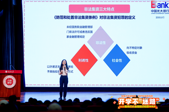 光大银行深圳分行消保专员曾瀚瑶“护航清楚 明辨是非”为主题,围绕非法集资的特性,新型案例等话题进行了案例分享,帮助大学生更好的了解防范非法集资知识,建立正确的金融理财观念。