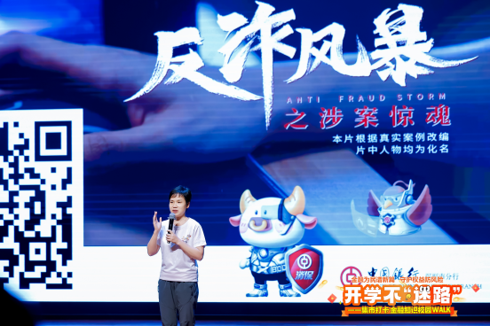 中国银行深圳市分行消保办公室副主任黄晓华现场分享了原创作品《反诈风暴之涉案惊魂》反诈微电影,根据真实案例改编,真实还原了大学生“涉案”诈骗的第一现场。以真实案例提醒大学生日常生活中要提高警惕,不轻信来源不明的广告、电话,不贪小利,保护好自己的“钱袋子”。