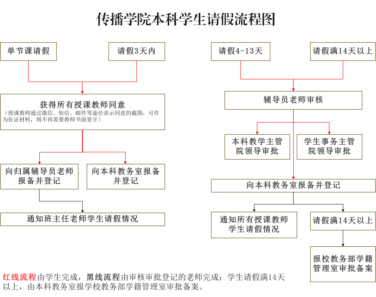 (2)学生请假时间满14天以上,需提供佐证材料,由辅导员老师审核学生提供的请假申请表及其佐证材料并登记,学生送教学事务主管领导和学生事务主管领导审批,批准后,送辅导员登记并通报班主任;学生向学院本科教务室报备登记,学院本科教务室报学校教务部学籍管理室审批备案,并通报所有授课教师学生请假情况。