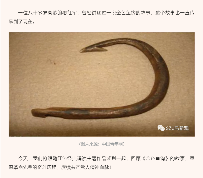 擦干了眼泪,我把老班长留下的鱼钩小心地包起来,放在贴身的衣兜里。我想:等革命胜利以后,一定要把它送到革命烈士纪念馆去,让我们的子子孙孙都来瞻仰它。在这个长满了红锈的鱼钩上,闪烁着灿烂的金色的光芒。