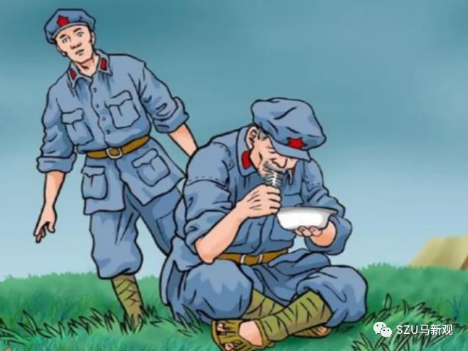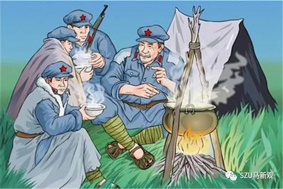 我端起搪瓷碗,觉得这个碗有千斤重,怎么也送不到嘴边。两个小同志不知道为什么,也端着碗不往嘴边送。老班长看到这情况,收敛了笑容,眉头拧成了疙瘩。他说:“怎么了,吃不下?要是不吃,咱们就走不出这草地。同志们,为了革命,你们必须吃下去。小梁,你不要太脆弱!”最后这句话是严厉的,意思只有我知道。